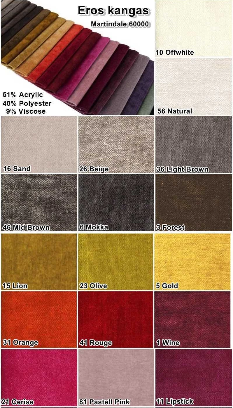 | Valitse Eros Kangas | Eros 1 – Wine, Eros 10 – Offwhite, Eros 11 – Lipstick, Eros 12 – Denim, Eros 15 – Lion, Eros 16 – Sand, Eros 17 – Concrete, Eros 2 – Midnight, Eros 21 – Cerice, Eros 22 – Turqouise, Eros 23 – Olive, Eros 26 – Beige, Eros 27 – Soft Silver, Eros 3 – Forest, Eros 31 – Orange, Eros 32 – Petrol, Eros 36 – Light Brown, Eros 37 – Antracit, Eros 4 – Black, Eros 41 – Rouge, Eros 42 – Ocean, Eros 46 – Mid Brown, Eros 47 – Fog, Eros 5 – Gold, Eros 51 – Aubergine, Eros 52 – Lagoon, Eros 56 – Natural, Eros 6 – Mokka, Eros 7 – Graphite, Eros 71 – Violet, Eros 81 – Pastell Pink, Eros 83 – Pastell Green, Eros 91 – Pastell Violet |