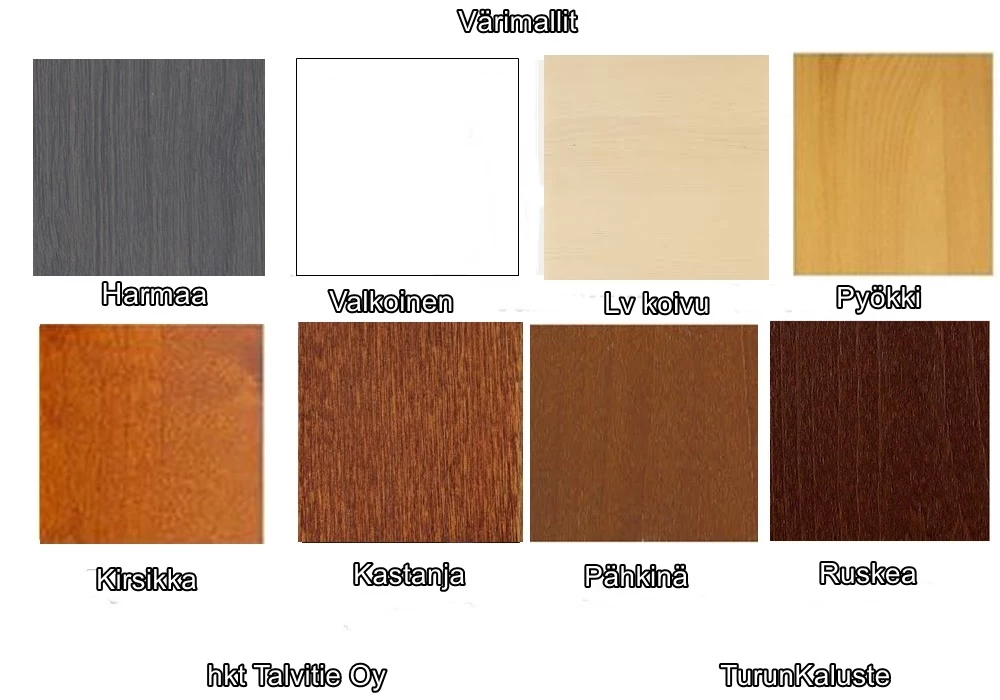 - Harmaa, Valkoinen,Luonnonväri koivu, Pyökki, Kirsikka, Kastanja, Pähkinä ja Ruskea.